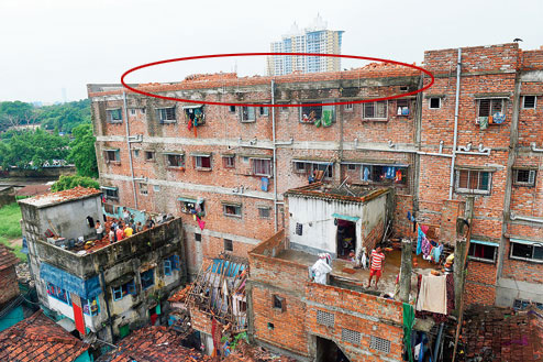 The building has no water reservoir, barely half-a-metre's gap with the walls of neighbouring buildings, thin outer walls without plaster, no main door and no lights on the staircases - all signs of an illegal construction.
