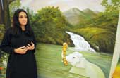 | Pushpamala N. before a painted scene in a fictitious photo studio. Photograph by Pradip Sanyal |