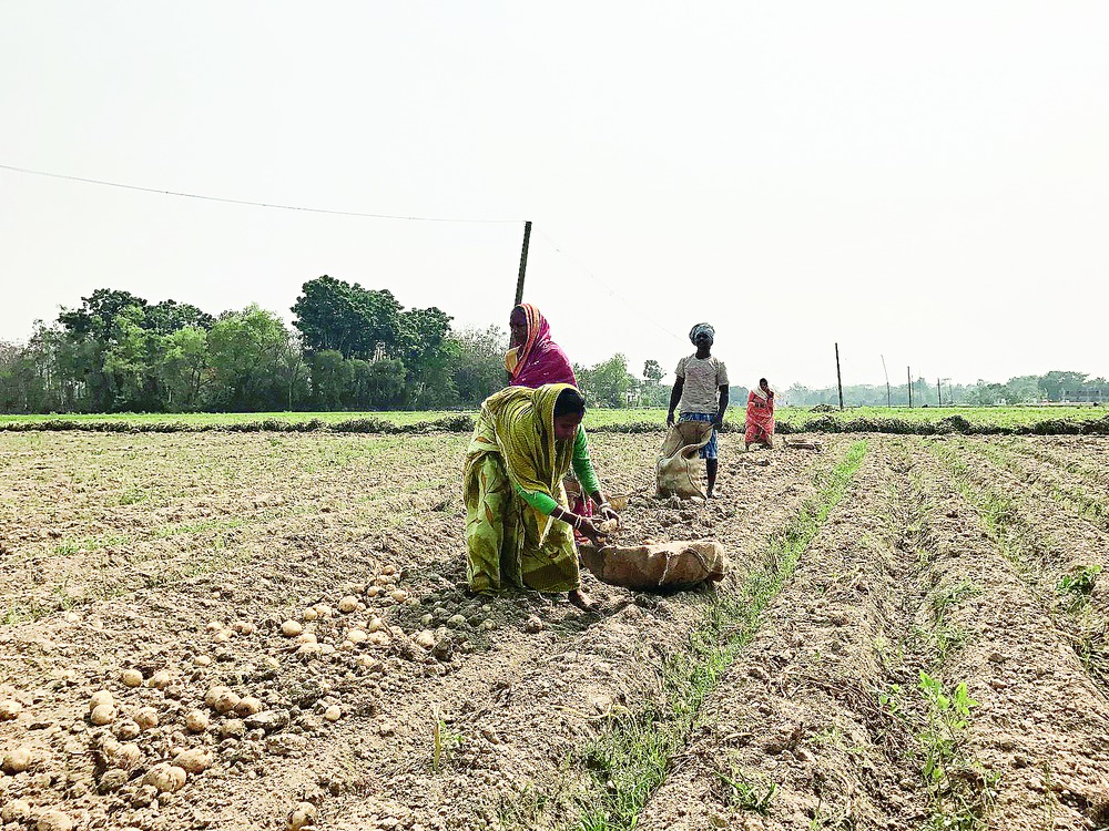 The farmer is hoping to make a profit around Rs 18,000 a bigha on the crop he is harvesting now using a power tiller fitted with an attachment specially designed for potatoes.