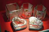 Attractive imported glass jewellery boxes are found in shapes of hearts and rectangles. A border with a sparkling silver finish makes for quite an ornate effect.