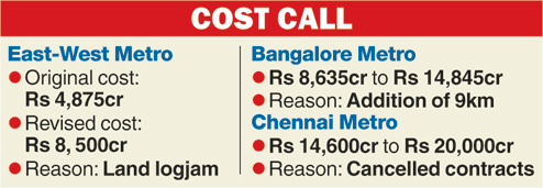 The cost of the East-West Metro has been revised from Rs 4,875 crore to Rs 8,500 crore after a seven-year land logjam during which only 42 per cent of the project was completed.