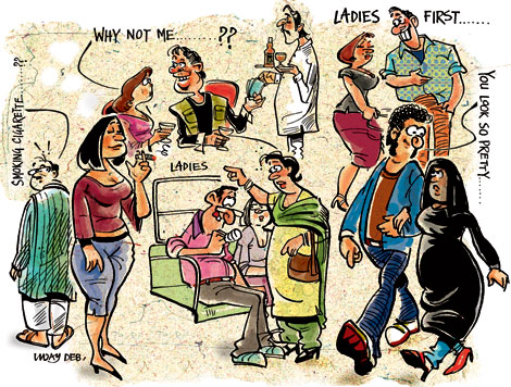There are a few places where women take advantage unabashedly. In queues gender can play an important role. Standing at the Metro ticket counter, or the railway counter, or the multiplex. Women have a habit of looking frail, or troubled, or ill, and making a gesture with their hands, which can mean “please”, “ektu” or “thodi si meherbani kijiye”, before they jump the queue.