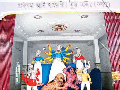 Raiganj, Oct. 15: For years, Durga puja organisers have been trying to outdo each other as far as themes, lighting and décor are concerned during the festive season, but the oldest puja here has chosen to cling to the tradition.