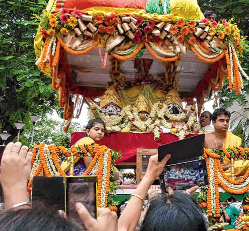 The chariot’s movement obviously blocked the roads but the drivers and commuters who got slowed down were not peeved. “This year we’re much better off as it’s a Saturday and it’s Rath as well as Id. So the office-going crowd is minimal,” said P.K. Boral, an auto driver on the Karunamoyee-Ultadanga route, who was waiting for the crowd to clear near AC Block. And when a devotee ran up and gave him and his passengers prasad of goja, his face broke into a grin.