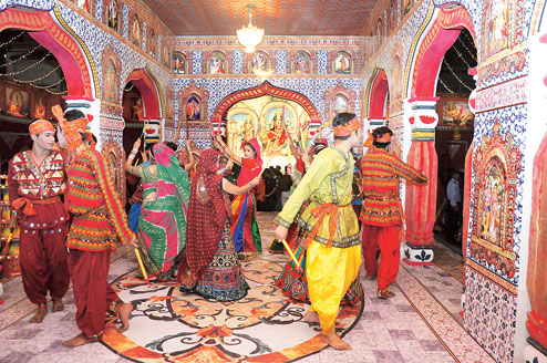 What: In keeping with the theme of the Navaratri festival in Gujarat, a colourful dandiya performance was staged every evening at the pandal of Bantra Sammelani. Every evening from 6pm to 11pm the dancers, dressed in traditional Gujarati dandiya costumes, performed to Gujarati folk numbers playing at the pandal. The dandiya dance was taking place inside the natmandir that was right opposite the main mandap where the Durga idol was placed. Visitors entering the pandal would have to walk around the central natmandir where the dancers were performing, on one side, and eight other smaller temples having idols of the eight forms of Durga on the other side. Though the dance continued till 11 at night, crowds thronged the pandal even later than that to catch a glimpse of the idol.