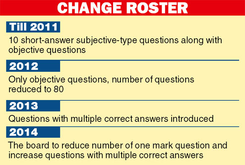 In 2012, the board had reduced the number of questions to 80. Till 2011, those appearing for mathematics had to answer 80 one-mark MCQ questions and 10 short-answer-type subjective questions, carrying two marks each. In the combined physics and chemistry paper of 100 marks, the examinees wrote 90 questions of which 10 were short-answer type.