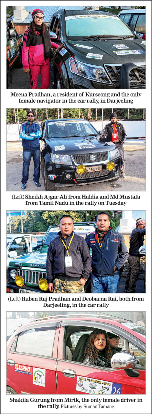 While 42-year-old Shakila Gurung from Mirik is the only female driver in the rally, 46-year-old Meena Pradhan is the only female navigator who will be assisting her nephew Ishwar. The aunt-nephew duo are driving a Mahindra XUV 500.