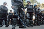 | Police ready for action as the Trinamul Congress rally winds its way through central Calcutta on Monday. Picture by Bishwarup Dutta |