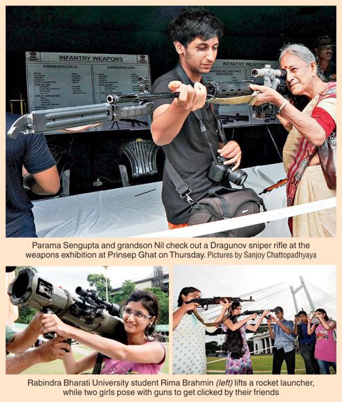 If Sarkar was excited holding the rocket launcher, Ashiqun Nabi was bowled over by the sniper rifle. "I have seen in several movies heroes or villains carrying such a gun and climbing highrise buildings to target people at a faraway distance. Today I got a chance to hold one and actually see through the tele-focus lens," said Nabi, a postgraduate student of geography at Rabindra Bharati University.