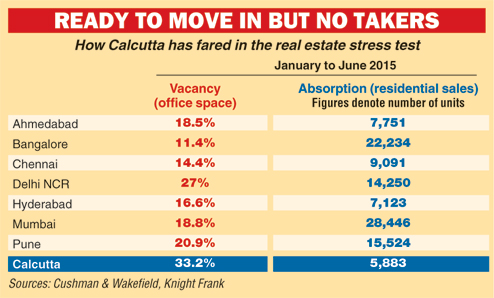 Cushman & Wakefield's report on office market last week explains why developers are cagey about putting more money into Calcutta. The report points out a 33.2 per cent vacancy in office space in the Calcutta market, the highest in India.