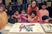 But Sukumar Roy enthusiasts were not entirely missing. Monginis, for instance, had responded by gifting a king-size birthday cake with a Hukomuko Hengla decoration on the icing, much to the delight of Sukumar Roy addicts Surjo (10) and Rochishnu Pramanik (5). The cake was ceremonially cut and distributed while Mahul presented their amazing rendition of Chor dhora to the traditional Torja gaan style. The presentations of Abol Tabol, Shabdakalpadrum and Ramgarurer Chhana were also interesting. “We draw from all kinds of music — classical, folk, rock and Tagore. We manage to switch smoothly from singing to reciting. Only we stick to the same scale,” explained Palash. Accompanying them were musicians Satya, Babu and Choton.