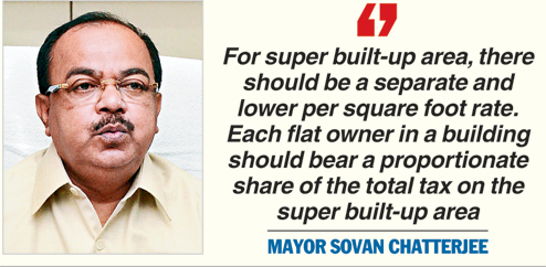 Mayor Sovan Chatterjee this week gave a sneak peek into the proposed calculation method that excludes super built-up area like common corridors, staircases, joggers' track, swimming pool and garden from the ambit of individual tax.