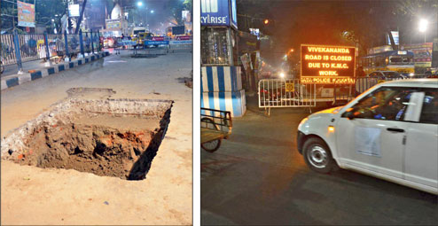 Maniktala: A stretch of Vivekananda Road near Maniktala has been closed to traffic after a portion of the road caved in on Sunday and the Calcutta Municipal Corporation dug a pit to detect and repair the cause.