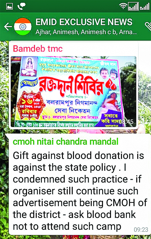 Guchhait put up the image at 7.52am today. A little over an hour later, the chief medical officer of health, Nitai Chandra Mandal, replied: "Gift against blood donation is against the state policy. I condemn such practice - if the organiser still continues such advertisement being the CMOH of the district - (will) ask (district) blood bank not to attend such camp."