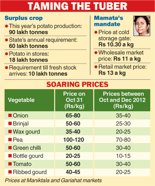 This was evident last week when the agricultural marketing minister declared that potato would not be sold at above Rs 14 a kilo. The result? Potato price shot up to Rs 18 a kilo from Rs 16/kg. On October 31, potato was priced Rs 20 a kilo at Maniktala market.