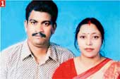 | Sharbani Paul and her husband Manabendra in a photograph from the family album. Sharbani’s parental house (facing arrow) in Barrackpore, where she had met her alleged killer five years ago. The spot (facing arrow) on the air force ground, barely a kilometre away, where the alleged killer fired around 10 bullets and claimed three lives. The house of suspect Pijush Ghosh at Sagarpara in Murshidabad’s Jalangi. The blue door, to its side, is the one the family uses as the main entrance. Standing in front of it with his back to the camera on Sunday evening is Pijush’s elder brother (facing arrow). Pictures by Amit Datta and Julfikar Ali |
