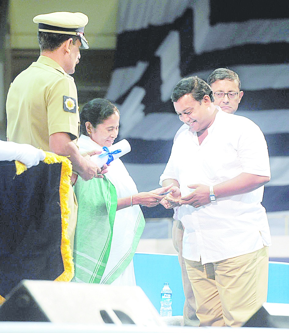 Chief minister Mamata Banerjee felicitates businessman Satyajit Chakraborty, who had in April rescued a newborn from a Sukanta Setu footpath in Jadavpur. The felicitation was part of the Calcutta police investiture ceremony. Metro had on April 23 reported how Chakraborty, 48, a resident of Garfa, had found the baby boy wrapped in plastic on the footpath.