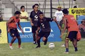 | Boys from Brazil in action against the Shyambazar lads. Picture by Sanjoy Chattopadhyaya Support for the visitors. Picture by Sanjoy Chattopadhyaya |