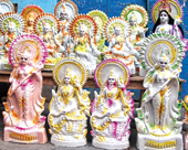 | Die-cast Saraswati idols lined up for sale at a city outlet. (Sudeshna Banerjee) |