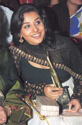 | Bollywood actress Vidya Balan took a trip down memory lane as she picked up the Dabur Vatika Hair Oil Anandalok Purashkar 2007 for best actor in the Hindi film category at the Science City auditorium on Wednesday evening. “My first award was the Anandalok Purashkar and I am back here for one more,” smiled the nostalgic Parineeta girl, who had started her film career in Calcutta four years ago with Bhalo Theko. Picture by Aranya Sen |