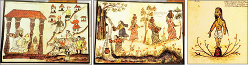 | Illustrations at the exhibition showing (from left) a money changer in Cambay, wives of merchants in Cambay, and a ‘peak’ from which ‘pagans’ sacrificed themselves. Pictures by Anindya Shankar Ray |