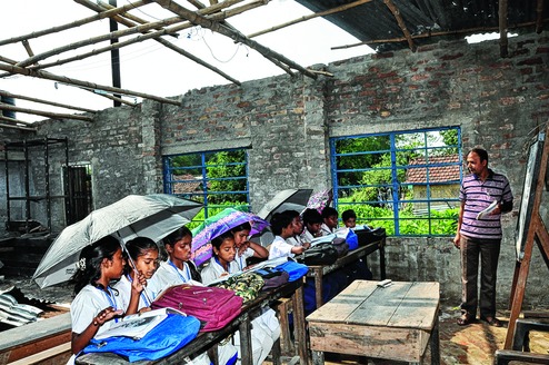 Santragachhi: Noni Deb sits in class, one hand raised to hold an umbrella, the other furiously jotting down notes. The 13-year-old's classroom has no roof and umbrellas are the students' only protection from sun and rain.