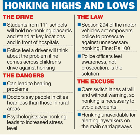 Called “a honky-tonk town” for the ear-splitting honking on every street, even near hospitals and educational institutions, students from 111 city schools will attempt to take the bull by its horns on Monday morning with a message for motorists: “No-horn please”.