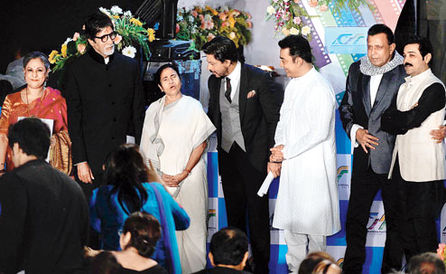 | Mamata Banerjee flanked by (from left) Jaya and Amitabh Bachchan, Shah Rukh Khan, Kamal Haasan, Mithun Chakraborty and Prosenjit |