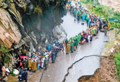 | People queue up on a road damaged by the flood in Chamoli on Tuesday |