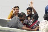 | Abhishek Bachchan finally joined wife Aishwarya at Agarpara to make Day 15 of Mani Ratnam’s Raavan shoot memorable. Ash was the first to arrive at Saheb Kuthi early on Tuesday, followed a couple of hours later by Abhishek. He was casually dressed in a brown kurta, trousers and sandals, while she glowed in a yellow angrakha as they sat side by side on a motor boat and headed off to shoot a song sequence on the Hooghly. Picture by Aranya Sen |