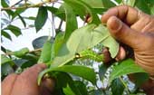 | Cash cocoon:A farmer displays a silkworm on a mulberry leaf. Picture by Himangshu Ranjan Deb |