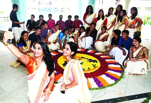 NUJS students click a selfie with the pookalam decoration made by them on the campus on Monday. Picture by Pradip Sanyal