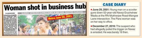Navaz Eruchshaw Wadia was walking down RN Mukherjee Road on June 29, 2001, when a scooter screeched to a halt beside her. A young man opened fire from point-blank range and the 52-year-old woman slumped to the ground. The office-hour crowd and the people manning the roadside eateries stood stunned, as Metro had reported in the next morning's edition.