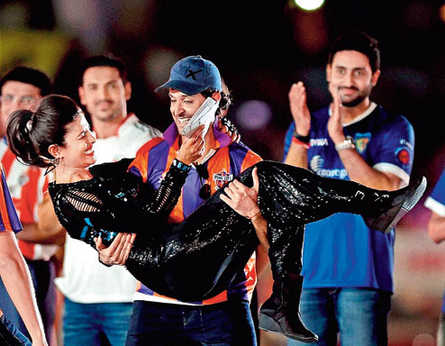 Priyanka Chopra as mistress of ceremonies was having a ball, from ribbing Ranbir to teasing Parineeti. But it took Krrish co-star Hrithik Roshan to sweep her off her feet. In one swift move, the co-owner of the Pune team picked up PeeCee and swung her around in his arms. Wow! After rocking the inaugural ceremony in a blingy black number, Priyanka slipped into a yellow-and-black peplum dress and walked into the VVIP box to meet her Bolly mates. “For me, football is about a foot and a ball!” was the punchline from the screen Mary Kom.