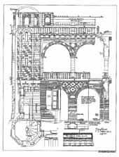 The design consisted of brick arches and windows separated by eight square towers on the front elevation from the east.
