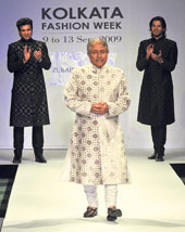 | Father-son trio Amjad Ali Khan, Amaan and Ayaan were the stars of Day One at Kolkata Fashion Week II as they took the ramp in black and white sherwanis by Zubair Kirmani. “This is my first time on the ramp.... It was good,” smiled the sarod maestro. His doting sons gave their father “10 on 10” on his debut. Day One of the five-day show at ITC The Sonar Calcutta, with t2 as partner, began with Ritu Kumar and ended with Wendell Rodricks, with Virender Sehwag walking for Rocky S in between. Picture by Pabitra Das |