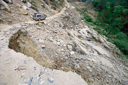 | A road destroyed by landslides in Uttarakhand’s Gauchar, which leads to some of the picture-postcard trekking trails that attract travellers from Bengal by the hordes during the holiday season. (AP) |