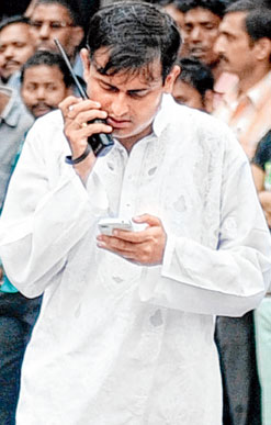| Shankudeb Panda works the walkie-talkie to manage star exits from the rally site on Monday. Pictures by Amit Datta and Pradip Sanyal |