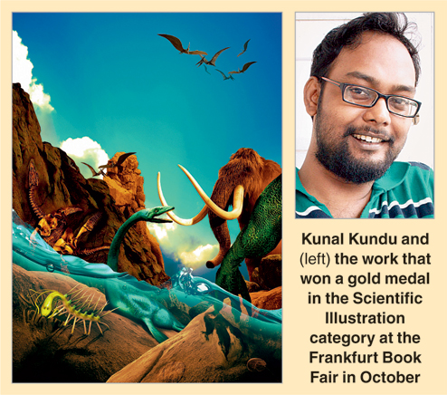 There were five categories at this year's awards: cover illustration, children's book illustration, editorial illustration, scientific illustration and theme illustration. Kunal won the Gold Award in the Scientific Illustration category. The cash prize, a trophy and a certificate have just reached his home in Patuli. "Illustrators from India can rarely afford to visit such important international book fairs even if it is to receive an award," he quipped.