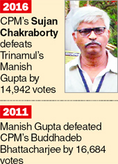 Chakraborty defeated power minister and former chief secretary Manish Gupta by 14,942 votes. In the 2011 Assembly elections, Gupta had defeated Bhattacharjee, his former boss, by 16,684 votes.