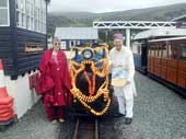 | David Barrie in traditional Nepali attire and his wife Moo flank Sherpa, the half-scale replica of DHR engines, at Fairbourne station. A Telegraph picture |