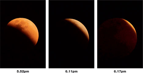 Various phases of the total lunar eclipse as seen from the Maidan. The eclipse marked a rare trinity of supermoon, blue moon and blood moon. “There wasn’t much cloud in the city skies but light pollution spoiled the experience in some pockets,” said Debiprosad Duari, director, research and academic, MP Birla Institute of Fundamental Research, Calcutta