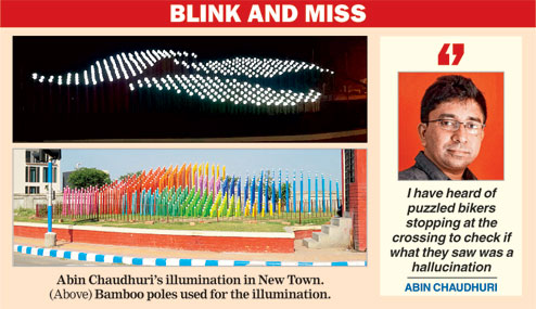 The installation on the four corner islands of the crossing is a replication on a smaller scale of a Kartik puja pandal decoration that Chaudhuri had conceived for a football club in his Bansberia neighbourhood in Hooghly district - a rising mass of light and colour, achieved using bamboo poles cut to specific heights and painted in blocks of rainbow hues.