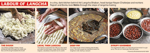 The most popular langcha is the Rs 5 lomba langcha. A smaller variety comes for Rs 3 and a super-size one for Rs 10. Then there’s the potol langcha, which is a “special” item with extra khoya (solidified milk).