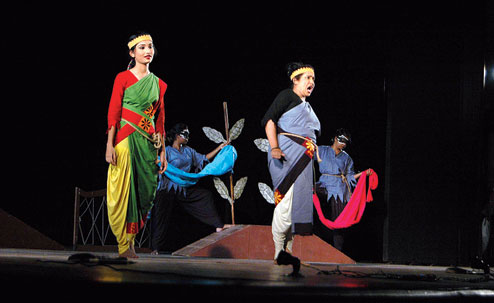 Bauria PRT opened the festival on the evening of May 16 with the humorous Baikunther Khata. Their play was followed by Nainam Dahati Pavakah staged by Theatre Formation Paribartak. An experimental production with a huge cast, written and directed by Amajit Basu, Nainam Dahati Pavakah transports the audience to the year 2049 when Tagore is shown to have been banned in India. The play portrays that Tagore’s works were anti-establishment and so they were being burnt. The evening’s programme rounded off with recitation by Samipesu’s Debarati Mukhopadhyay, who recited some of Tagore’s romantic poems.