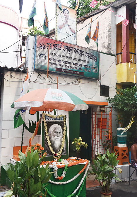 On NK Ghosal Road, part of Ward 91 in Kasba, a portrait of Tagore encircled by the ubiquitous rajanigandha sat under a board that bore the legend Jago Bangla, the Trinamul Congress mouthpiece.