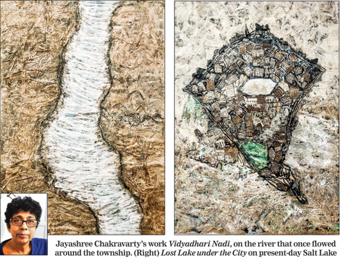Over the last 10 years Chakravarty has worked to give artistic expression to the changing landscape of the township and her personal equation with it. She shows the Vidyadhari river in its heyday and as a dying stream later on. She shows the resilient weeds trying to survive after the calamity and shows butterflies and insects sticking together in the face of an endangered habitat. She shows the transition from marshland to sand-land and finally the map of Salt Lake filled in with a concrete jungle.