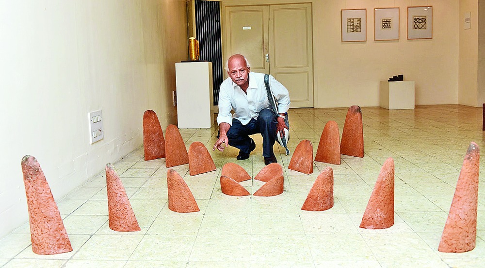 Then the relevance of figures and mathematics to his works sinks in as one sets eye on the spare terracotta and metal forms that, irrespective of size, have the aloofness and dignity of monoliths. When the artist, surprisingly lithe for a 76-year-old, arranges them in a sequence that emphasises their swelling or receding order, one realises that this rhythm has much to do with the complex form of musical compositions. This is what he called "evolution and reverse evolution."