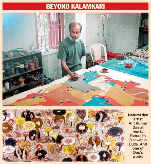 Ajit Kumar Das has not really gone astray from the ancient kalamkari tradition, but he has used his imagination to break away from it and create works of art which extend beyond the reach of craft. He has used his consummate skills to leave behind the gods and goddesses that kalamkari artists excel in and experiment with forms and colours the way that any other contemporary artist would. Only his craft is steeped in tradition and he uses natural dyes.