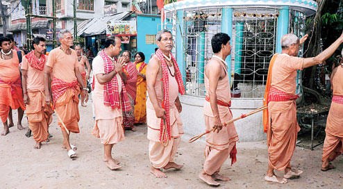 “The length of the fast depends on personal ability. A devotee can take sannyas for a minimum of five days or can keep it for a month, depending on how long he or she can sustain it,” said Roop Kumar Ghosh, the chief sannyasi at Panchanan temple at Baksara Charaktala. “The temple is over 500 years old. The Shivalinga is also different from the usual ones. Baba Panchanan is believed to have risen from a pond,” said Ghosh. The Shivalinga is tall, like a kasthi pathar (touchstone) pillar and not rounded at the top. The locals have immense faith.